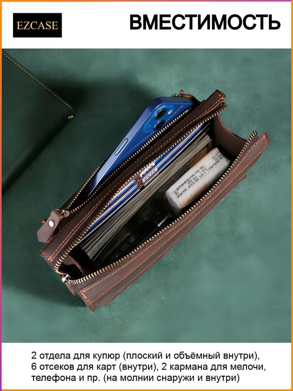 Вместимость: 2 отдела для купюр (плоский для быстрого доступа и объемный для крупных сумм); 6 отсеков для карт (удобное расположение для банковских, дисконтных и визитных карточек); 2 кармана для мелочи, телефона или документов (один на молнии снаружи, второй – внутри для особо ценных вещей).